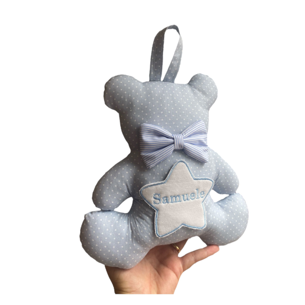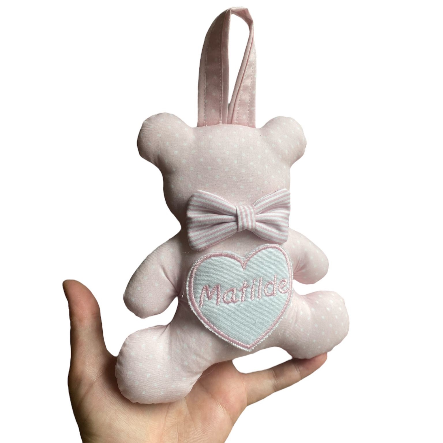 - DESCRIZIONE: Dolce orsetto rosa o azzurro realizzato con stoffe in cotone con tonalità tenui e nome personalizzato ricamato con filato rosa o azzurro da richiedere sia per bimbo che per bimba. Da utilizzare come mini fiocco nascita o ricordino, regalo per neonati, orsetto in cotone soffice e delicato disponibile per bimba e per bimbo. Adatto anche per decorare la cameretta o il passeggino. In cotone rosa chiaro o con tessuto azzurro tenue.