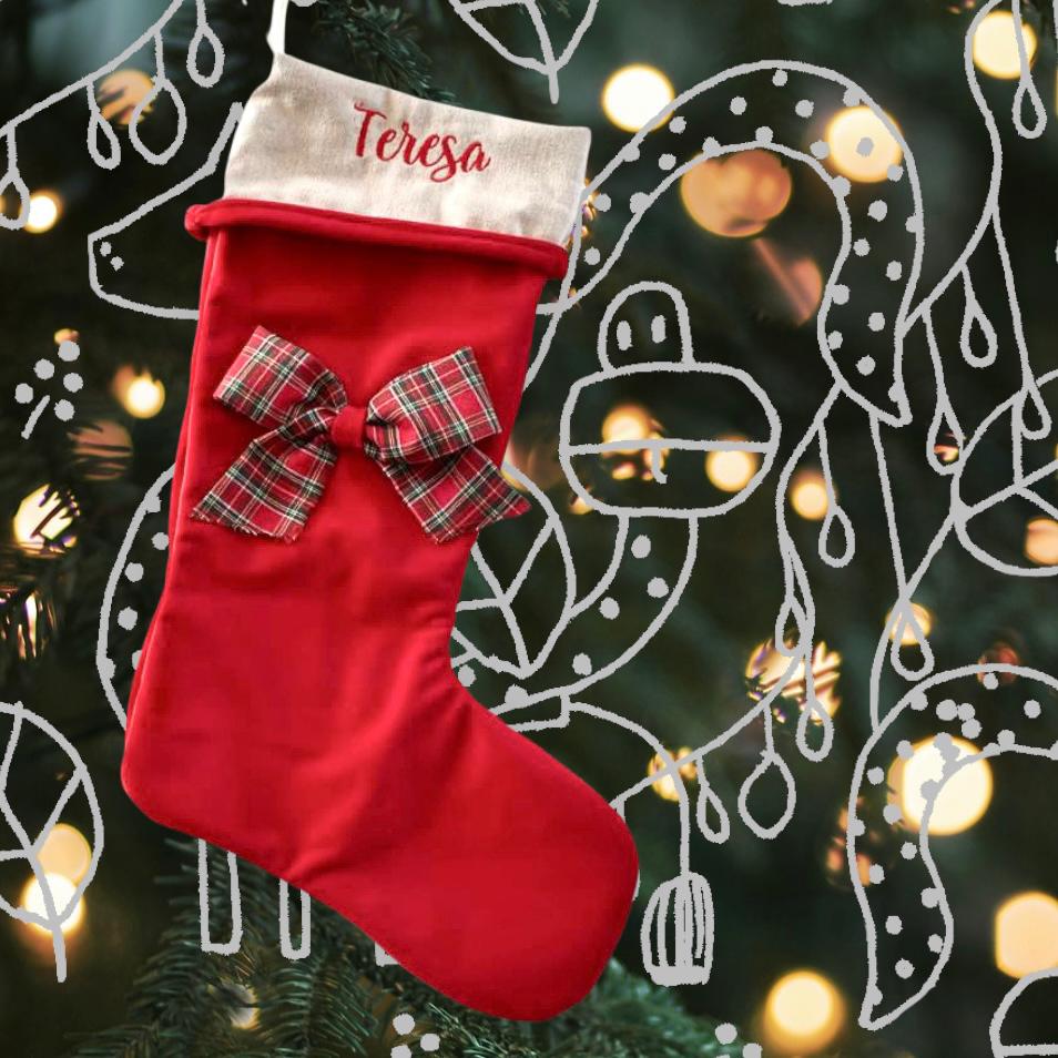 Calza befana personalizzata – Calza di Natale – Decorazione natalizia – calza di Natale in velluto rosso con fiocco in tartan e nome