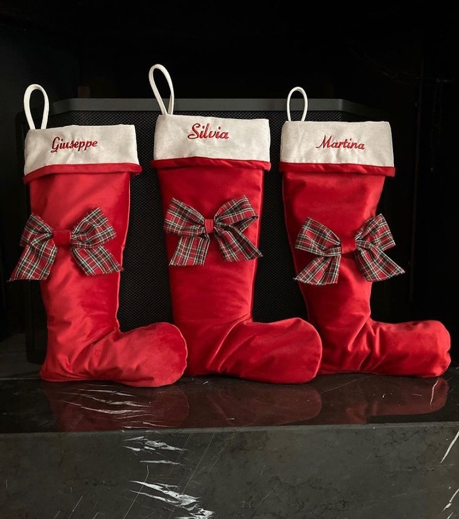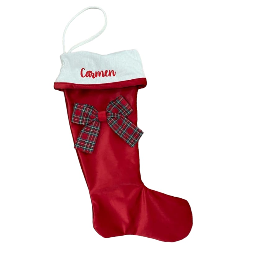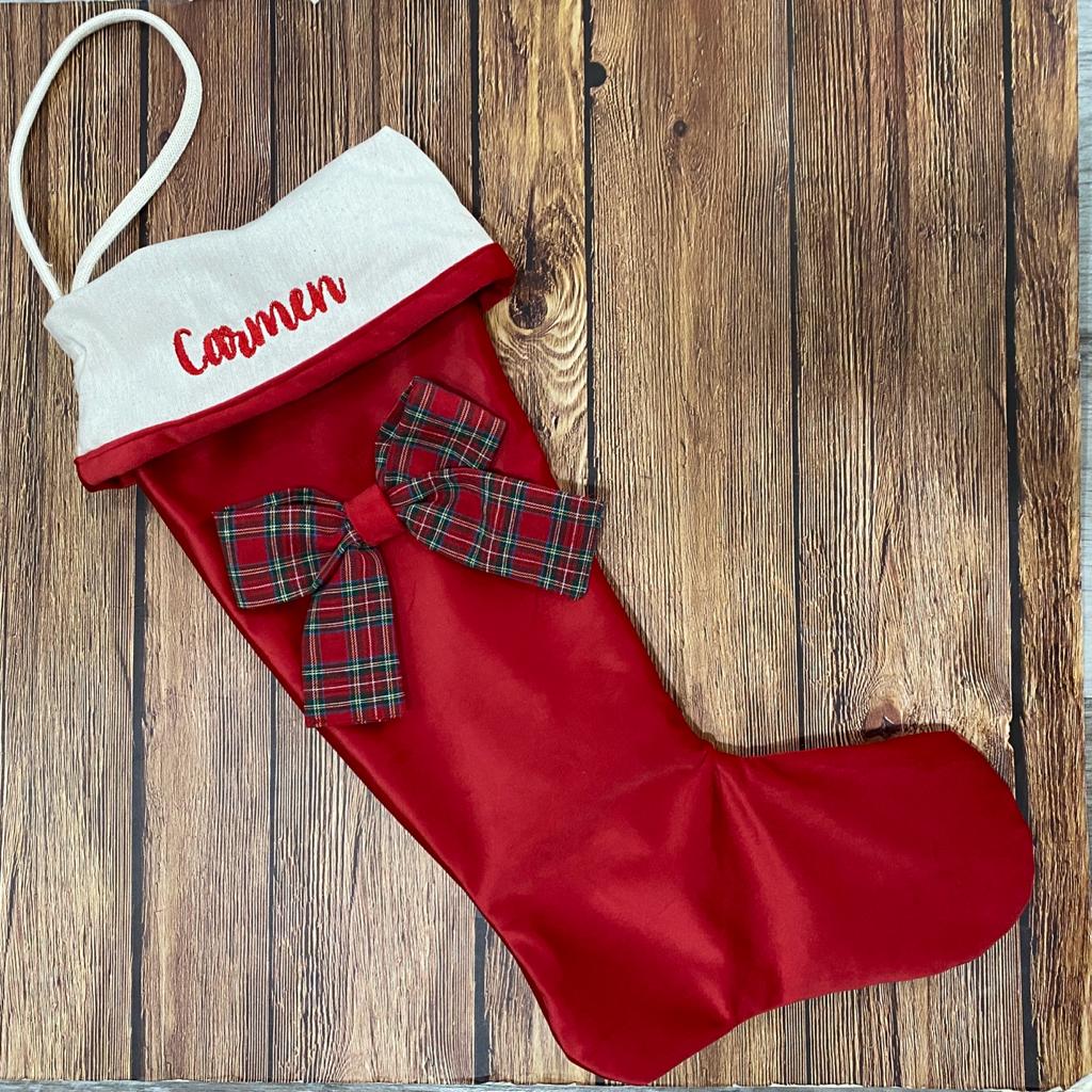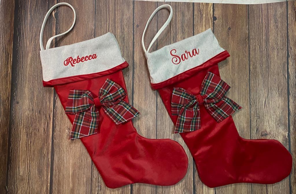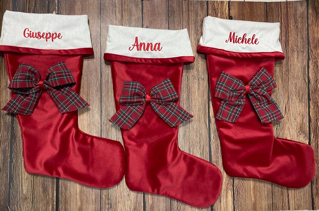 🎁MATERIALI : la calza di Natale con nome è realizzata a mano in velluto rosso e stoffa. E’ arricchita da un elegante fiocco in tartan