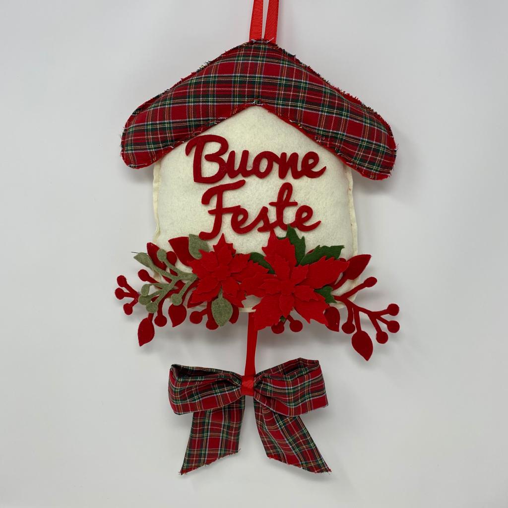 🧵PERSONALIZZAZIONE : Il fuoriporta natalizio a forma di casetta presenta la frase “Buone feste “. Ma è anche arricchita da un fiocco pendente in tartan e decorazioni stile shabby chic. .