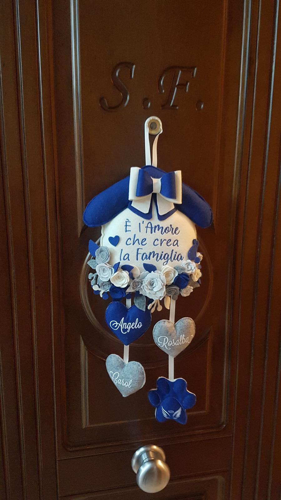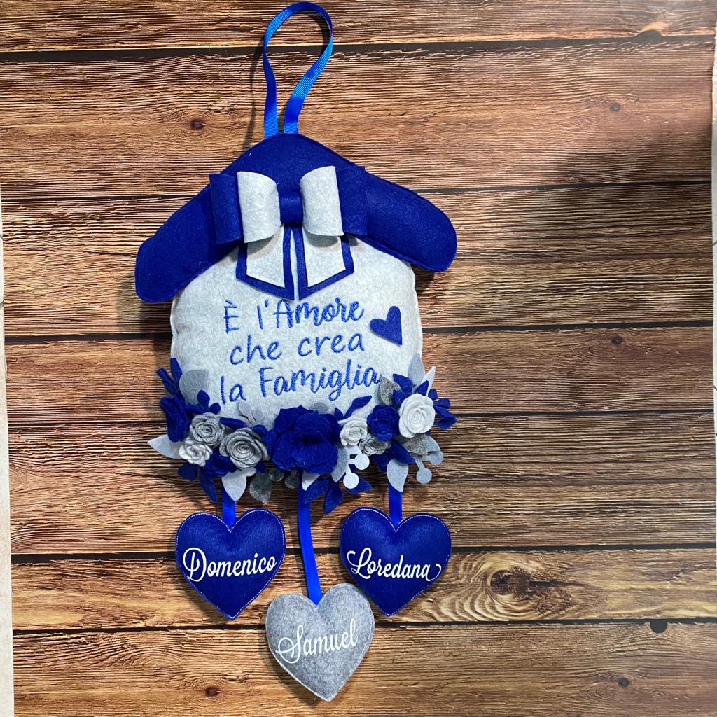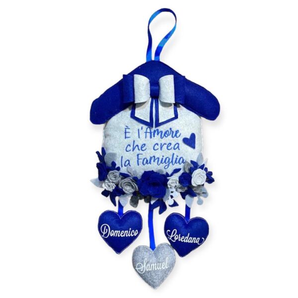 🧵PERSONALIZZAZIONE : Il fuori porta a forma di casetta presenta la frase ” E’ l’amore che crea la famiglia “. Ma è possibile aggiungere il nome ( max 10 caratteri) di ogni componente della famiglia sui cuoricini pendenti del fuoriporta.