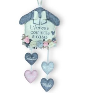 🧵PERSONALIZZAZIONE : Il fuori porta a forma di casetta presenta la frase ” E’ l’amore che crea la famiglia “. Ma è possibile aggiungere il nome ( max 10 caratteri) di ogni componente della famiglia sui cuoricini pendenti.