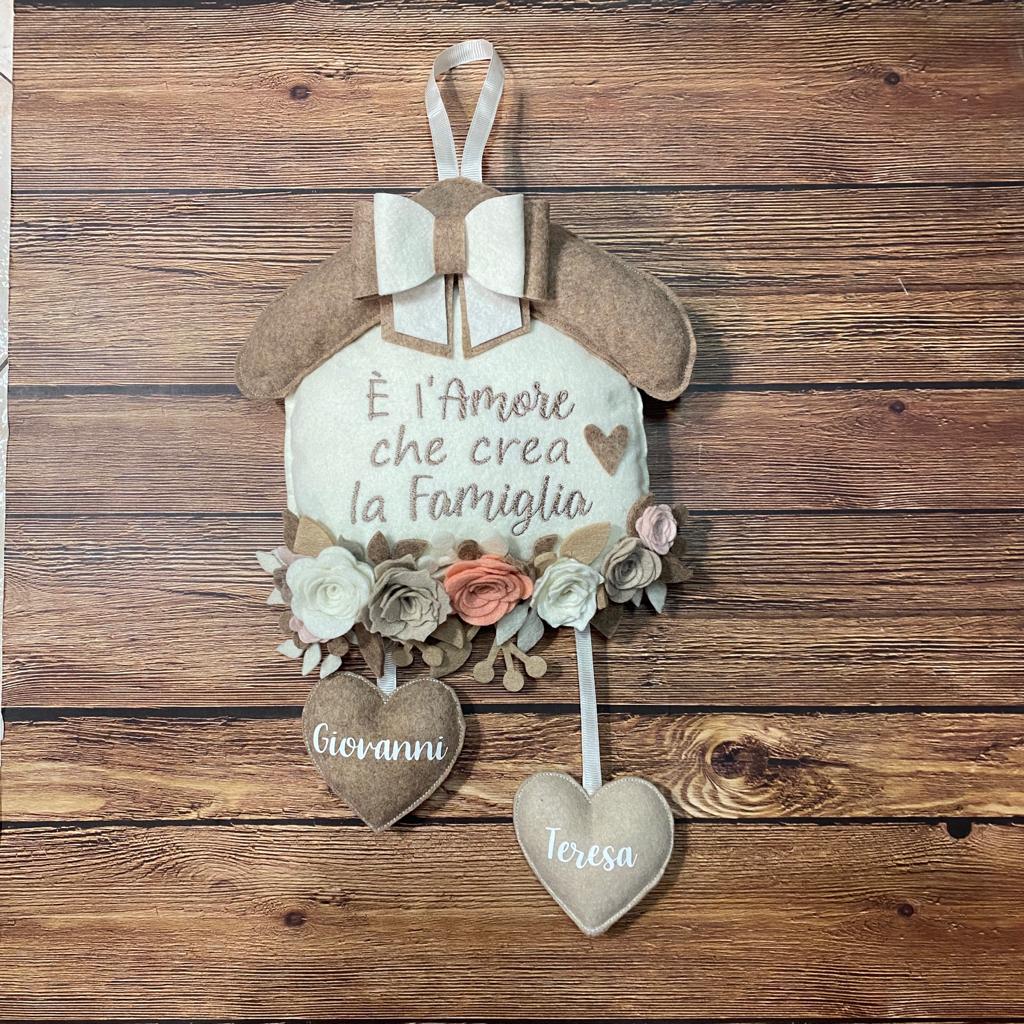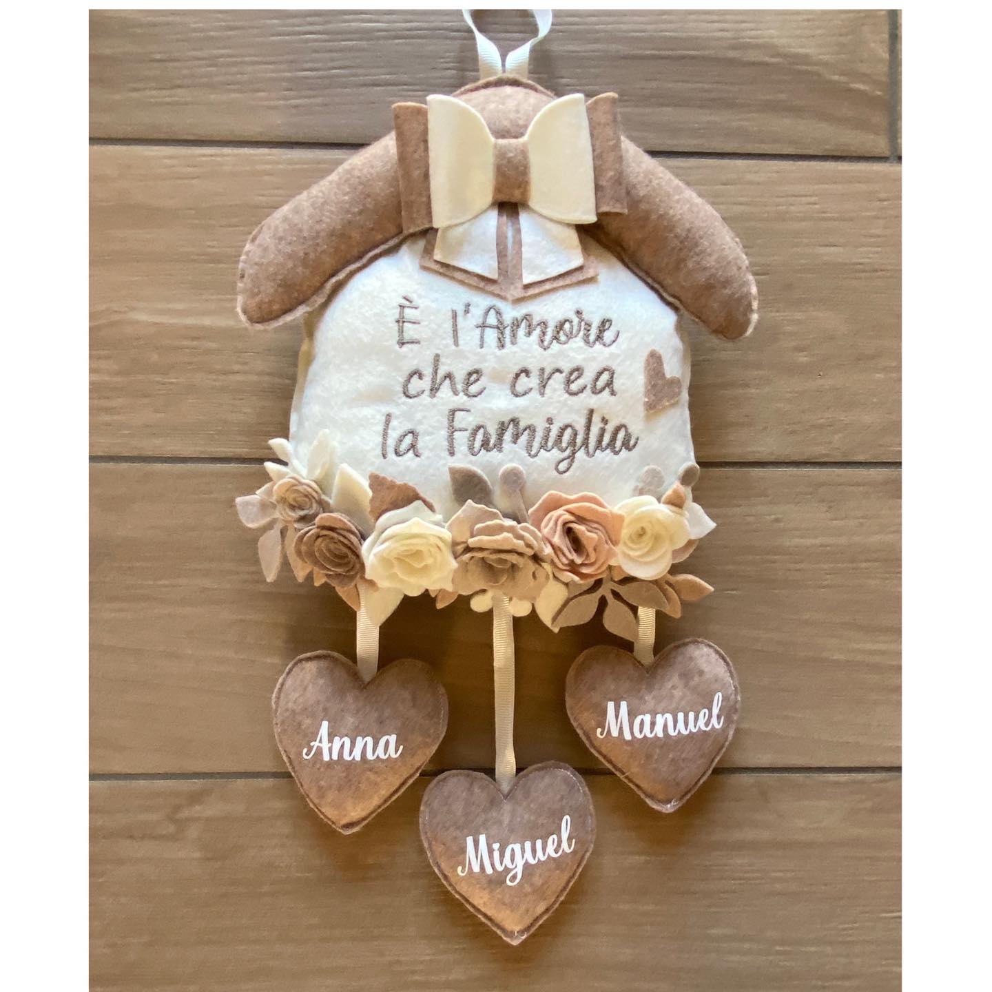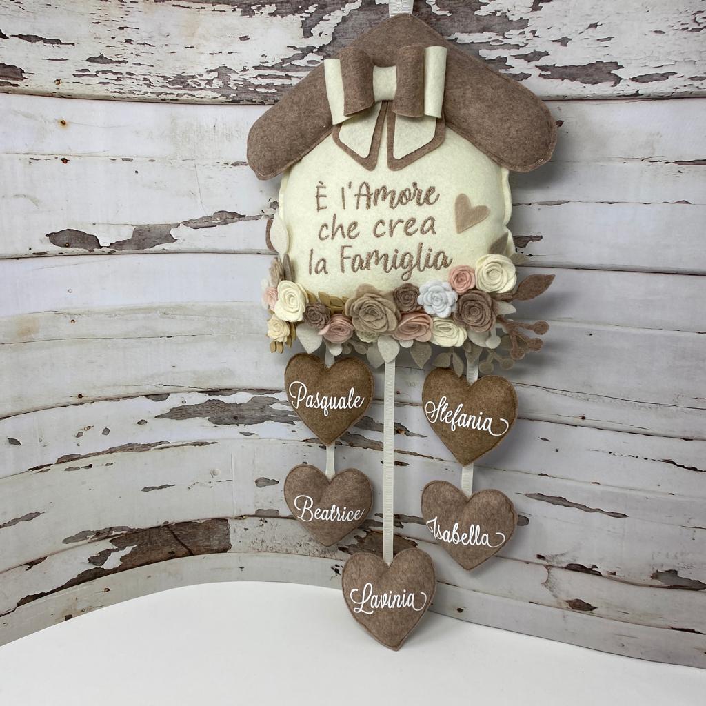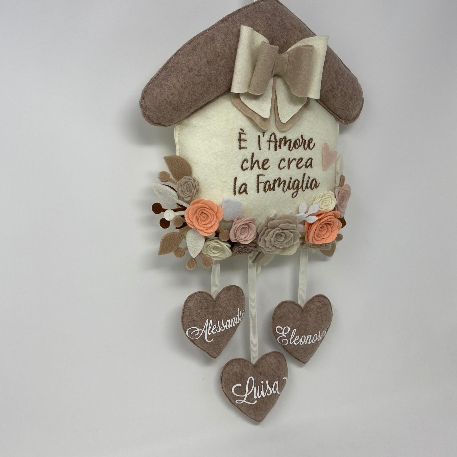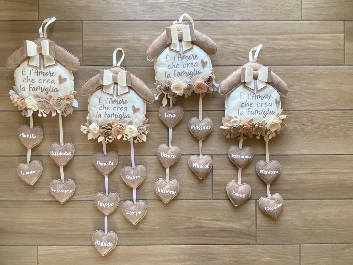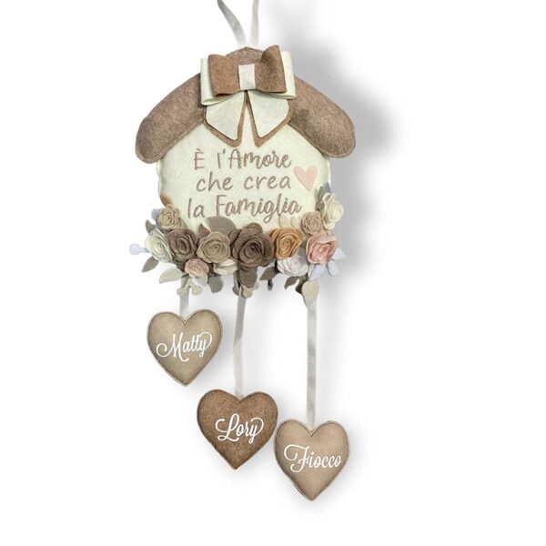 🧵PERSONALIZZAZIONE : Il fuori porta a forma di casetta presenta la frase ” E’ l’amore che crea la famiglia “. Ma è possibile aggiungere il nome ( max 10 caratteri) di ogni componente della famiglia sui cuoricini pendenti.