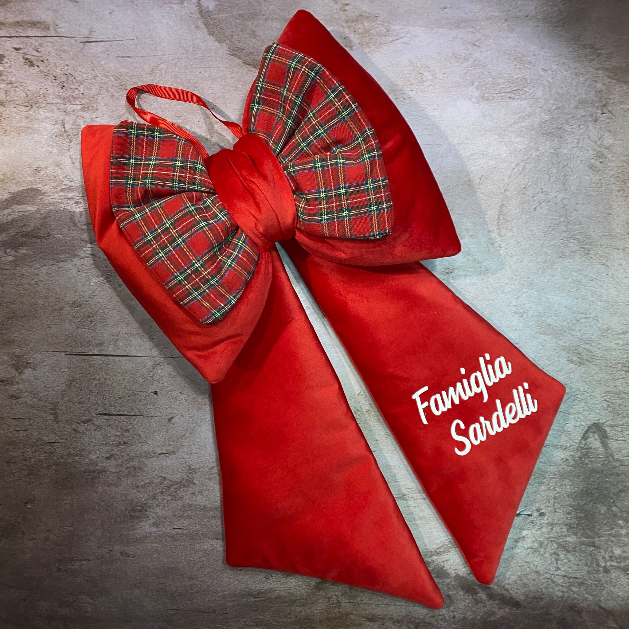 Fiocco in velluto rosso e tartan – Modello Gonfietto – Decorazione albero di natale – Fiocco natalizio in velluto – Fuoriporta Natale – Puntale per albero di Natale – Decorazioni Natalizie