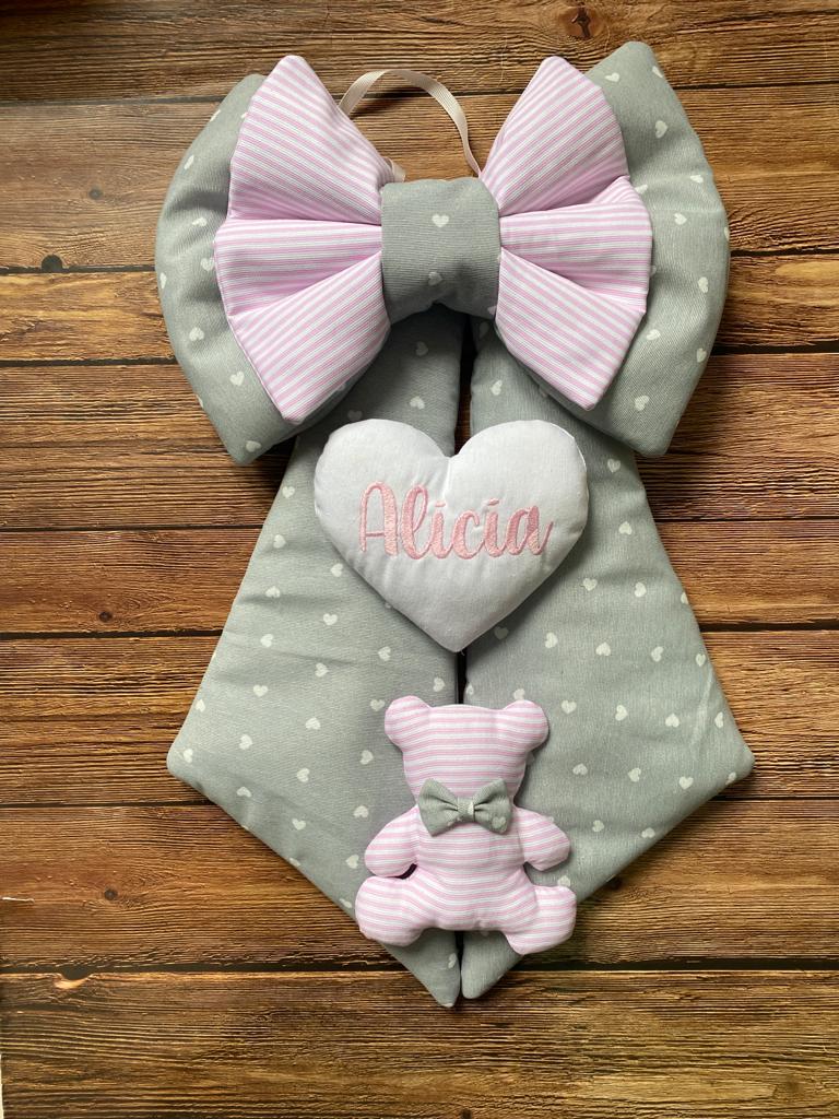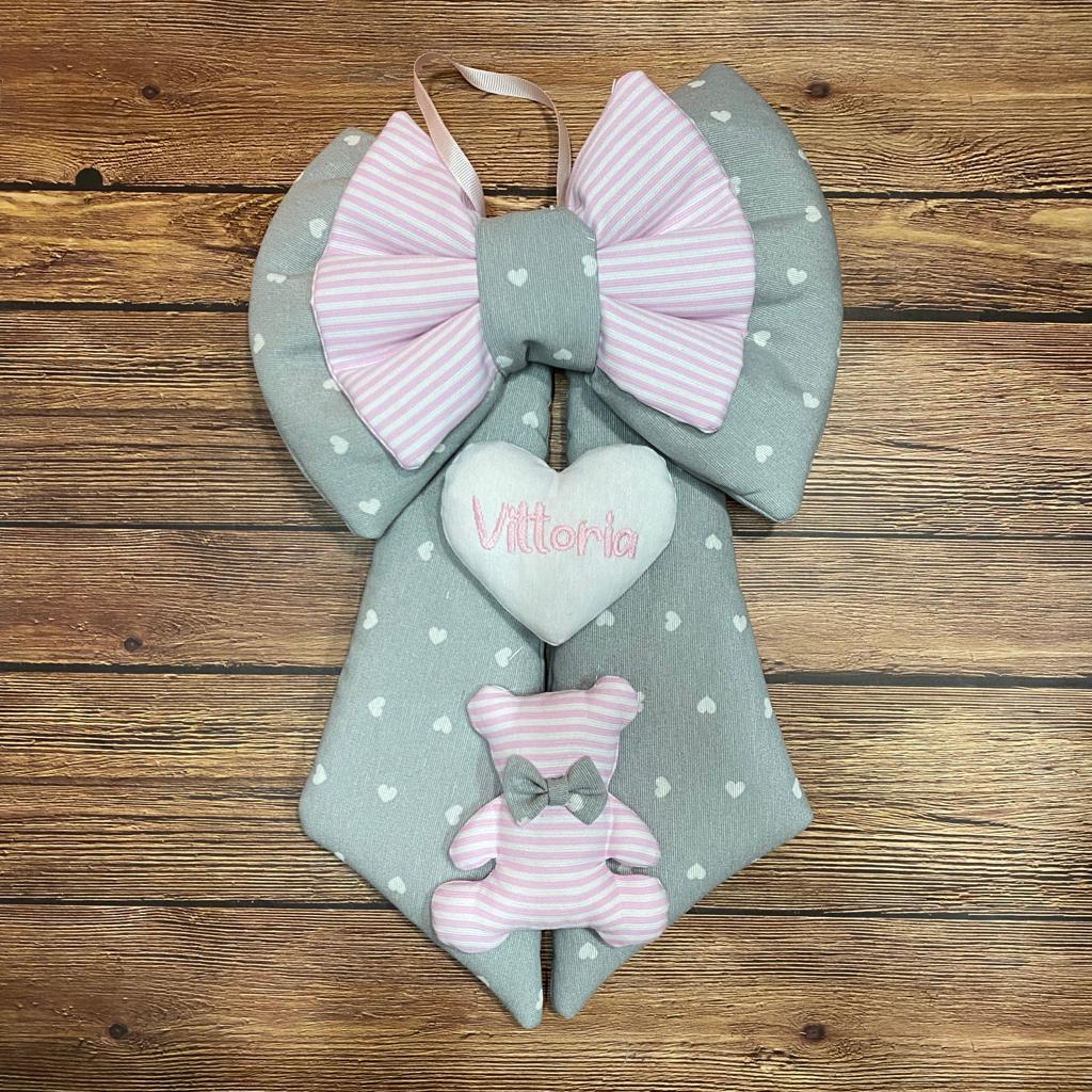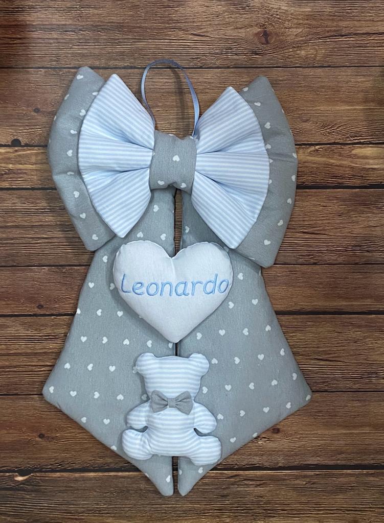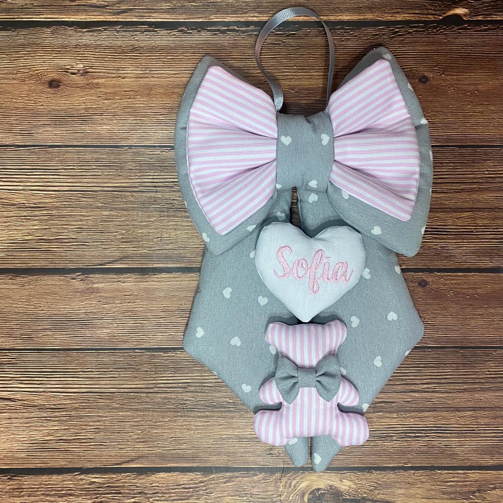 STOFFA: La base del fiocco è realizzata in grigio. Con la possibilità di scegliere anche tra: grigio a pois, grigio a cuoricini e grigio a stelline. (N.B: DETTAGLIO STOFFA: le dimensioni e i toni dei pois e dei righi potrebbero variare). I dettagli e le decorazioni del fiocco sono realizzati a righi rosa o azzurro (N.B: lo spessore dei righi potrebbe variare)
