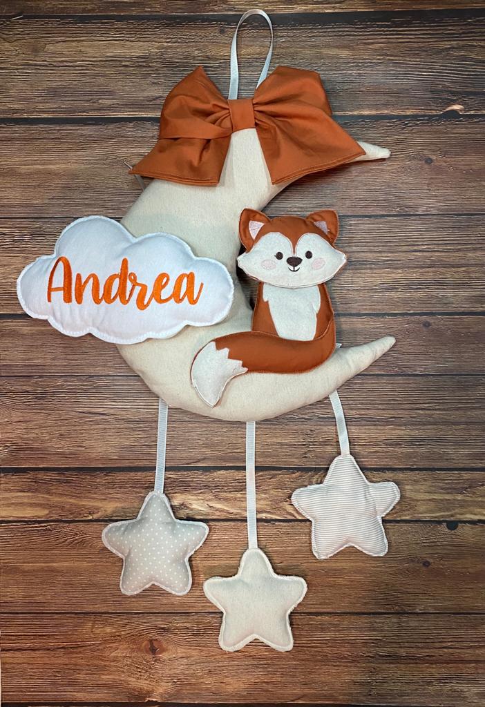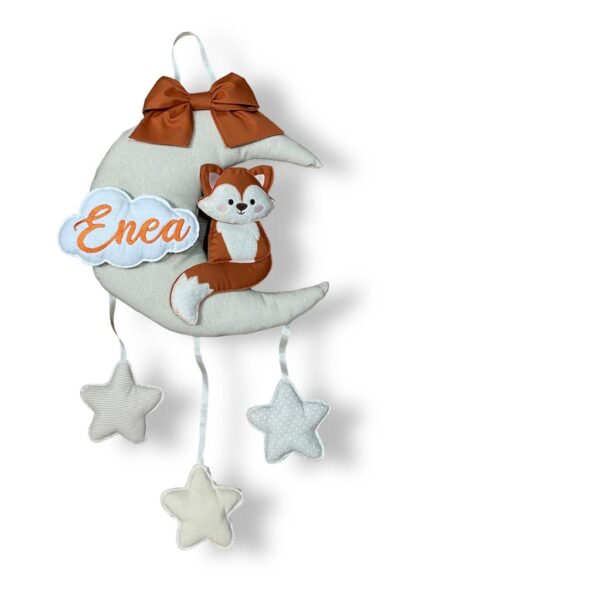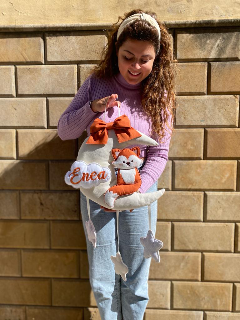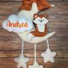 🤲 [FATTO A MANO] Il fiocco nascita bimbo bimba Pri Frog è un prodotto artigianale. Proponiamo un fiocco nascita originale con volpe e luna. La coccarda nascita neutra è caratterizzata da una dolce volpe appoggiata sulla luna realizzata a mano, arricchita da tre stelline pendenti e personalizzata dal nome ricamato sulla nuvoletta bianca. La luna con volpe e nome personalizzato può essere utilizzata per annunciare la nascita o da appendere in cameretta come decorazione .