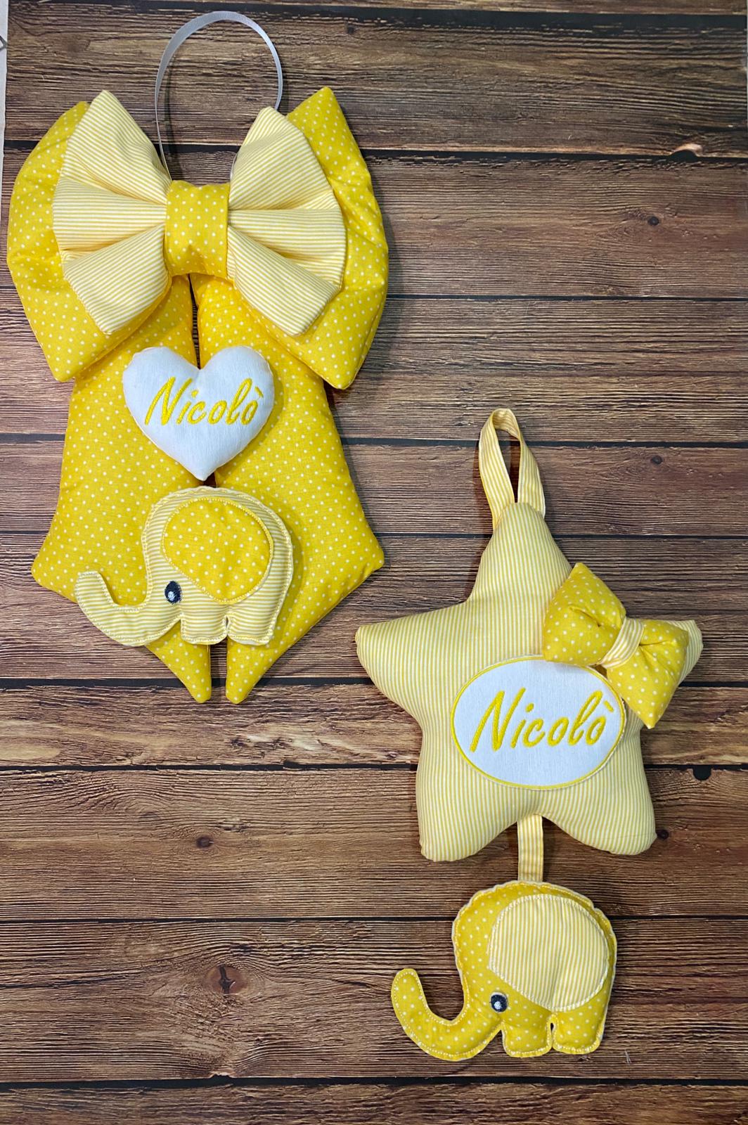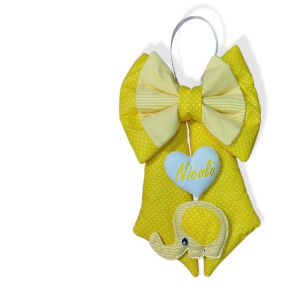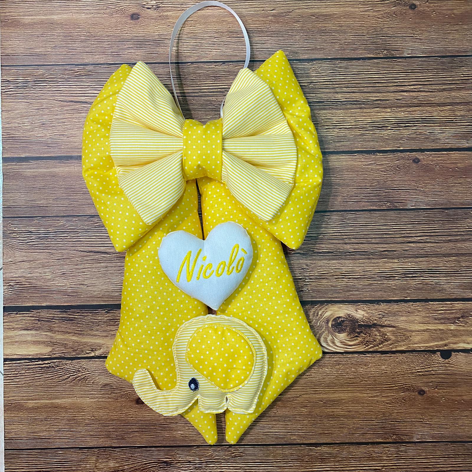 🤲 [FATTO A MANO] Il fiocco nascita neutro Pri Frog è un prodotto artigianale. Proponiamo il classico fiocco nascita giallo bimbo bimba, realizzato in cotone di prima scelta con base gialla a pois e dettagli in giallo a righini. Il fiocco nascita giallo è arricchito da un elefantino e da un soffice cuore incluso di nome ricamato personalizzato. La fantasia di base è in giallo a pois i dettagli (elefantino e parte sopra del fiocco: giallo a a righini. N.B: DETTAGLIO STOFFA: le dimensioni e i toni dei pois e dei righini potrebbero variare). I dettagli e la parte superiore del fiocco verranno realizzati a righini rosa o azzurro (N.B: lo spessore dei righini potrebbe variare)