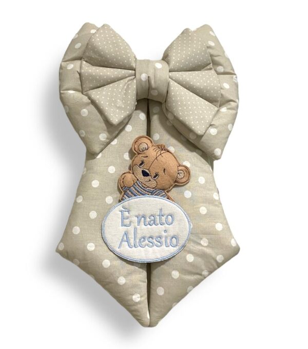 Fiocco nascita neutro – Coccarda nascita tema orsetto – Fiocco nascita beige pois – Coccarda nascita bimba bimbo – Fiocco nascita con orsetto ricamato e nome