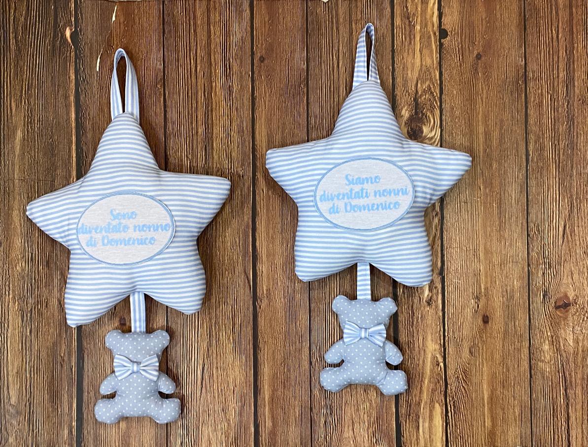 DESCRIZIONE: Dolce fiocco nascita bimba bimbo a forma di stella rosa o azzurra con orsetto e nome personalizzato. La fantasia di base è azzurro/rosa righi doppi + dettagli pois azzurro/rosa. Il nome sulla coccarda nascita originale viene aggiunto alla frase per i nonni e ricamato con filato rosa o azzurro, da richiedere sia per bimbo che per bimba. Fiocco nascita per i nonni a forma di stella con orsetto, soffice e delicato disponibile per bimba e per bimbo. Decorazione adatta anche per decorare la cameretta realizzata in cotone rosa chiaro o con tessuto azzurro tenue.