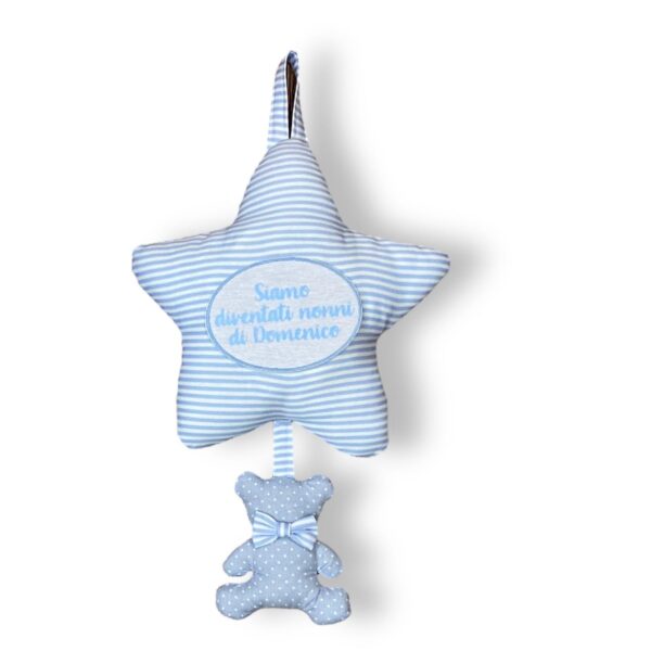 - PERSONALIZZAZIONE: È possibile personalizzare il fiocco nascita (max 10 caratteri) con il nome del neonato (maschio o femmina) che viene realizzato ed applicato sulla soffice mezzaluna bianca attraverso lettere colorate.