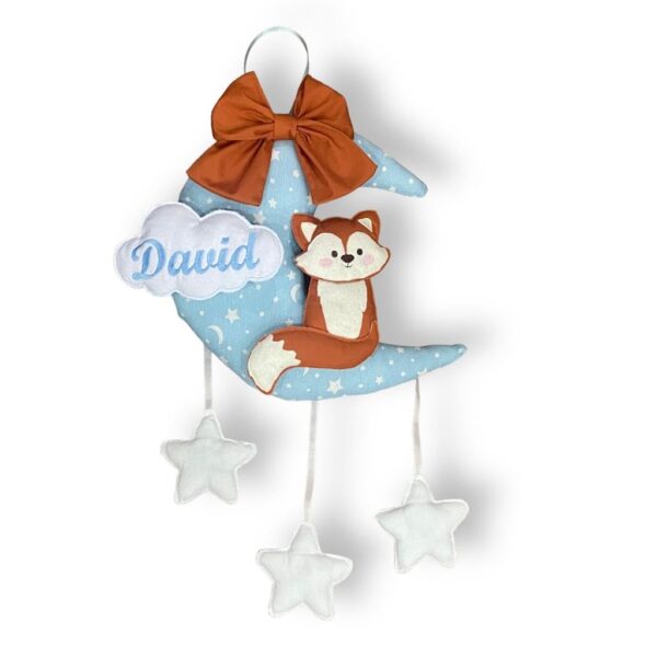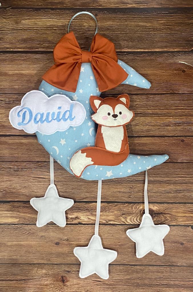 🤲 [FATTO A MANO] Il fiocco nascita volpe Pri Frog è un prodotto artigianale. Proponiamo un fiocco nascita bimba bimbo originale con volpe e luna. La coccarda nascita a fantasia luna e stelle è caratterizzata da una dolce volpe appoggiata sulla luna realizzata a mano, arricchita da decorazioni pendenti e personalizzata dal nome ricamato sulla nuvoletta bianca. La luna con volpe e nome personalizzato può essere utilizzata per annunciare la nascita o da appendere in cameretta come decorazione .