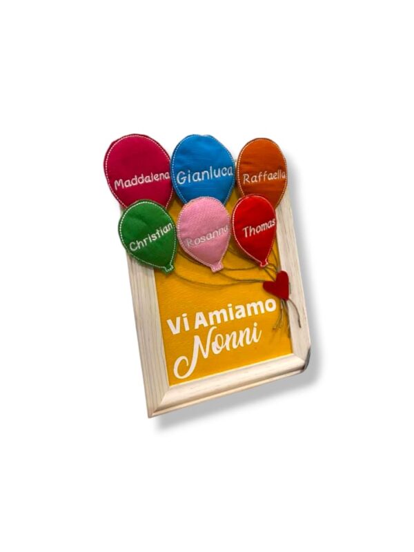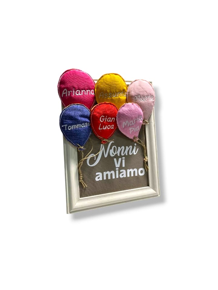 ✂ [PERSONALIZZAZIONE] Il quadretto per i nonni può essere personalizzato con una scritta (max 15 caratteri) ed è possibile scegliere il tono di colori ed il numero di palloncini da applicare sul quadretto.