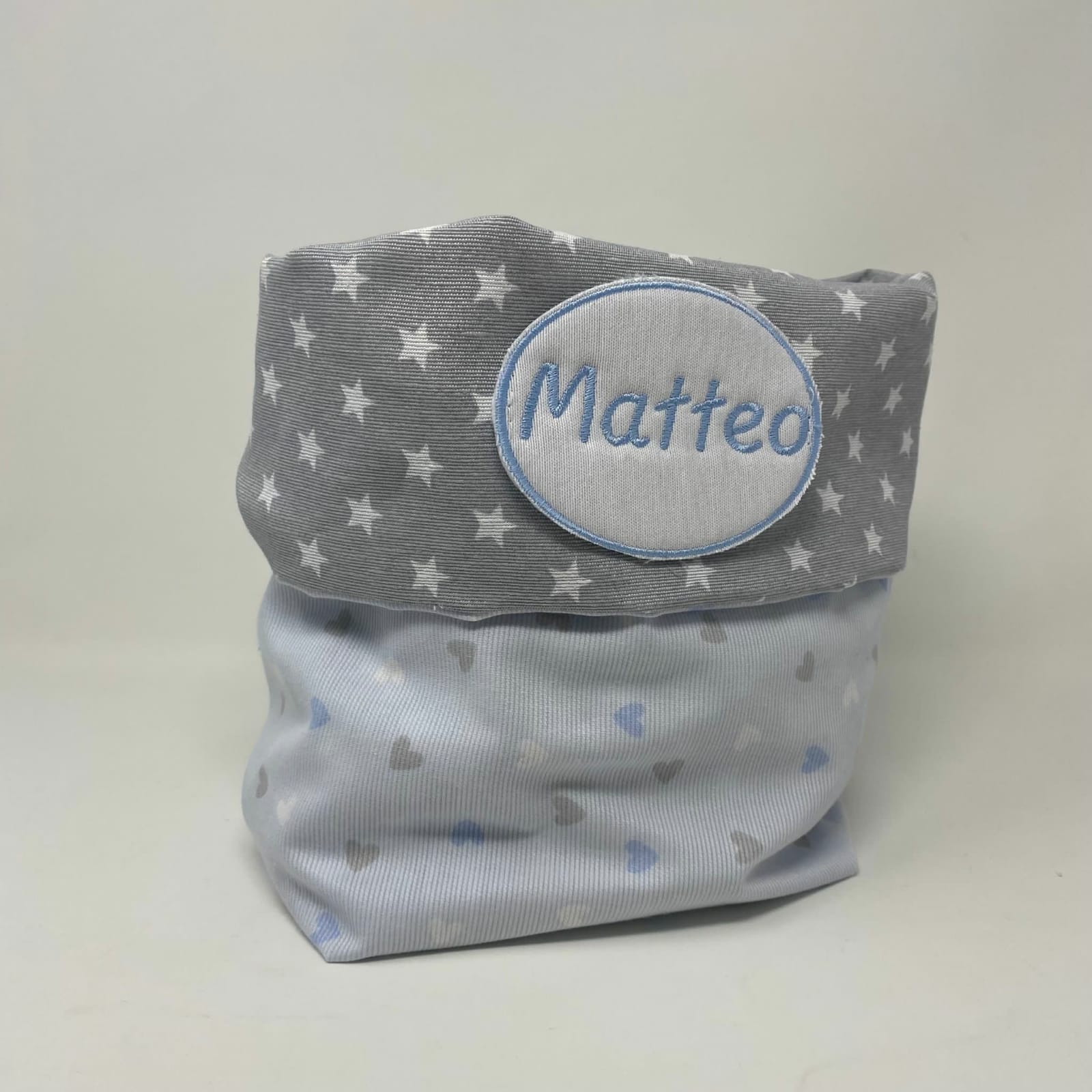 - 🤲 [FATTO A MANO] Il sacco porta oggetti per bimbo Pri Frog è un prodotto artigianale. Proponiamo un sacchetto multiuso da utilizzare come porta cose, porta confetti o porta pannolini, realizzato in cotone e con nome ricamato. Il sacco porta oggetti bimbo è arricchito dal nome personalizzato. La fantasia di base è azzurro con cuoricini e grigio con stelline. .