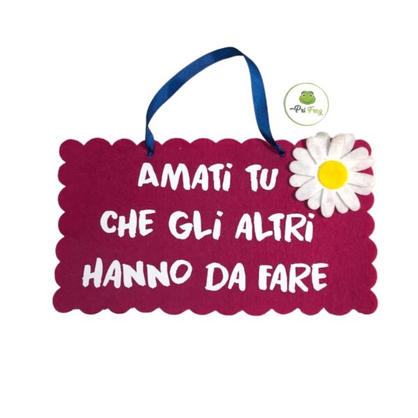 Targhetta artigianale – Fuoriporta in feltro – Dietro porta con scritta “Amati tu che gli altri hanno da fare” –
